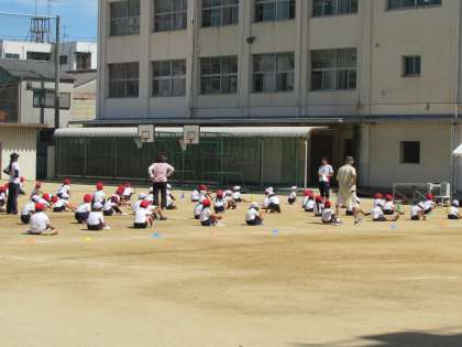 1年生の練習の様子です。1年生が運動場で、団体演技の練習をしています。どの場所に立ち、どの場所へ移動するのか、先生から指示されています。少し暑かったけれど、よい姿勢で話を聞くことができています。