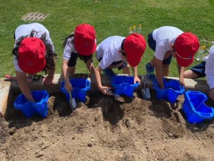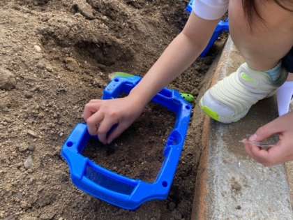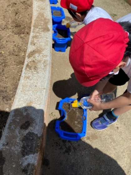 1人1人自分の植木鉢に土を入れ、あさがおの種をまきました。