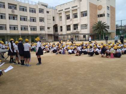 運動場で児童集会を行いました。 なかよし活動班でならびました。 今日は、代表委員会の発表でした。