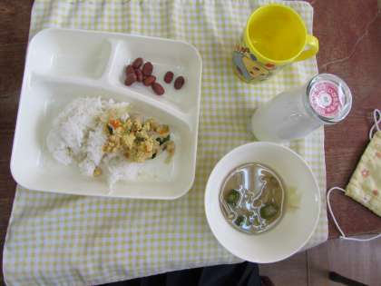 本日の給食の献立をご紹介します。本日の献立は、親子どんぶり、すまし汁、金時豆の煮物、牛乳でした。