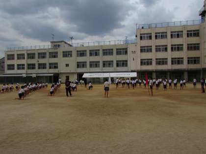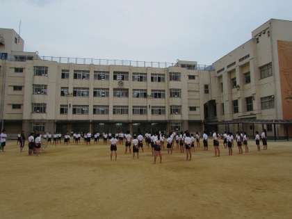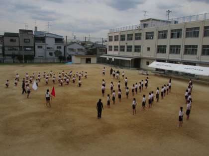 応援団が、運動場で練習しています。赤組、白組の団長がリードして、皆で力強く、応援練習をしています。