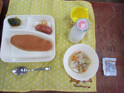 本日の給食の献立をご紹介します。本日の献立は、コッペパン、りんごジャム、フランクフルトのケチャップソース、スープ、焼きかぼちゃ、牛乳でした。