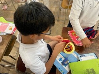 昨日の学習参観の続きです。画用紙でできた輪っかを組み合わせています。ただの輪っかが球に変わってきました。