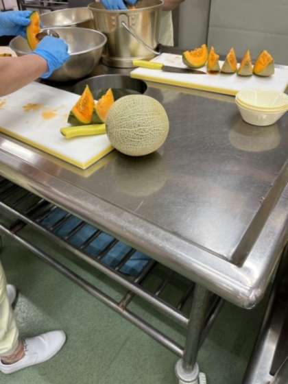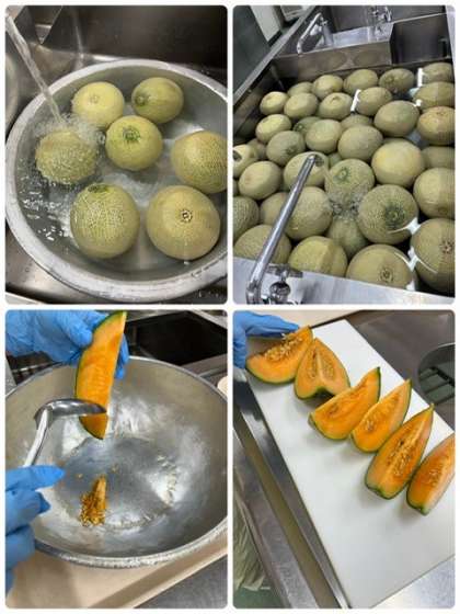 下の写真はメロンを調理する様子です。ただ切り分けるだけでなく、