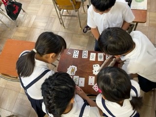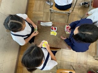 悪天候のため、休み時間は教室で過ごしています。カードゲームや折り紙をみんなで楽しんでいます。