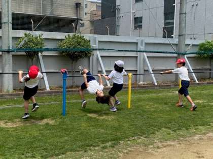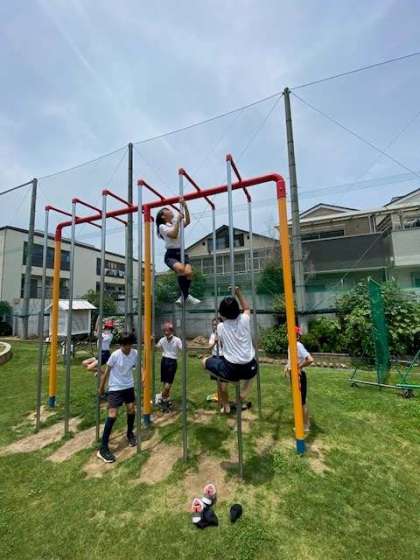 運動場では鉄棒とのぼり棒に取り組んでいます。