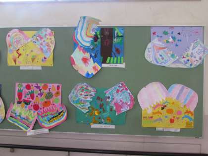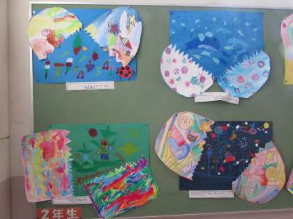 2年生の作品をご紹介します。図画工作「ふしぎなたまご」です。画用紙いっぱいにたまごを描き、絵の具で自由に塗りました。その卵を割って、中からどんなものが飛び出したら楽しいか、考えながら貼ったり、描いたりしていきました。