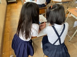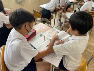 登場人物の中から中心人物を考えています。心情の変化を手がかりに友だちと話し合っている様子です。