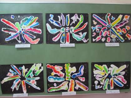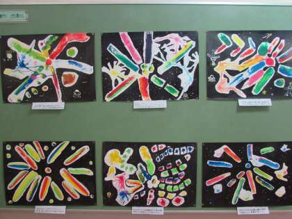6年生の作品をご紹介します。6年生が、筆ではなく、定規やストローを使って、絵の具で宇宙を表現しました。普段とは違う道具を使うことで、その表現の面白さに気づきました。