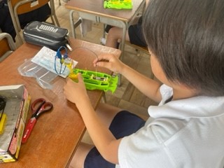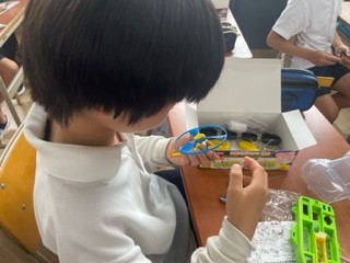 プロペラのついたものを作っています。銅線を持って悩んだり、見る角度を変えて悩んだりする等、みんなよく考えています。