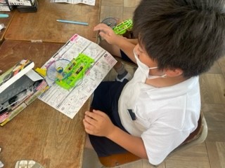 プロペラの回り方を確かめています。銅線がうまくつなげられずプロペラが回らない子もいますが、教え合ってできるようになりました。