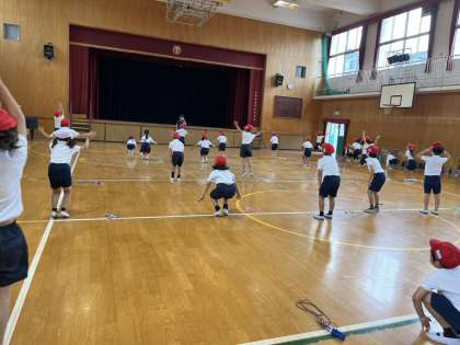 天候が悪かったので、体育館で水遊びの学習について、バディーを組んだり、入り方を学んだりしました。