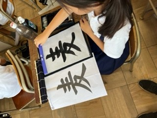 お手本をよく見て字のバランスやはらいに注意しながら書いています。