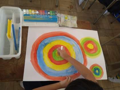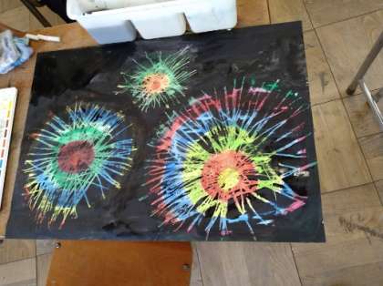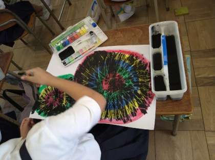 絵の具で着色したものに「ろうそく」で線をひいて、黒色で着色しました。