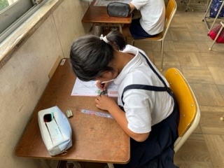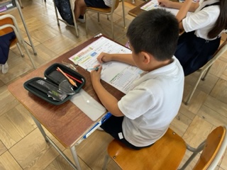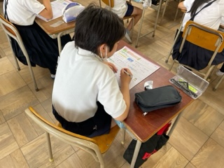 1学期のまとめのテストに取り組んでいます。わり算や大きい数、分度器で角度を調べる学習もしました。これまでの学習を思い出してがんばっています。
