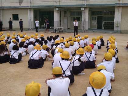 防犯訓練のようす 前回よりも1分もはやく運動場に避難することができました。