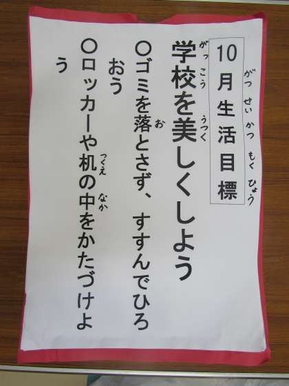 今月のせいかつのめあては、「学校を美しくしよう」です。具体目標は、