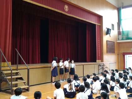 児童集会のようす 「何が通ったかな??」をしました。 幕の間を通ったものを当てるクイズをしました。