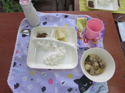 本日の給食の献立をご紹介します。本日の献立は、ご飯、たまご豆腐、豚肉と野菜の煮物、おかか菜っ葉、牛乳でした。