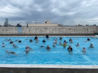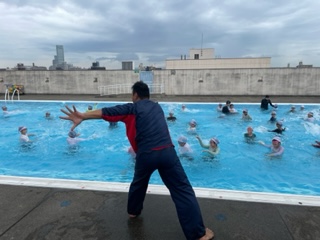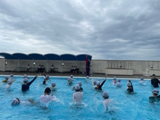 着衣泳の学習に取り組んでいます。落ち着いて行動することがめあてです。始めはいつもの「千本アクア」からスタートです。