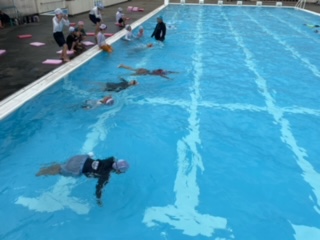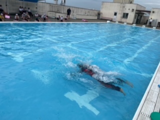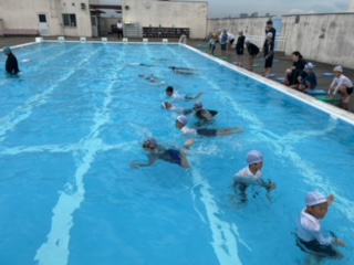 最後は水の中に落ちてしまった時の対処です。浮いて落ち着いたあとに、プールサイドへ戻ります。たくさん学習することができました。