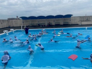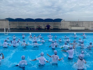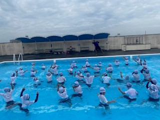 先日の水遊びの学習では、1年生の発達段階に合わせて、着衣泳を行いました。服を着たまま水の中に入っても、「落ち着いて行動する」ということをめあてに学習しました。少々動きづらくても、いつもどおりの動きができることを経験しました。