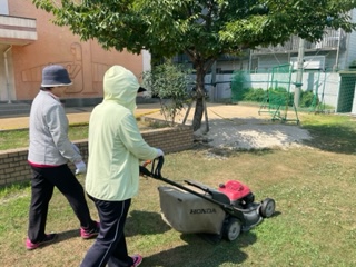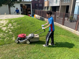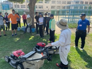 次は芝刈り機の説明を聞きました。実際に体験すると思うように動かせず、大変でした。