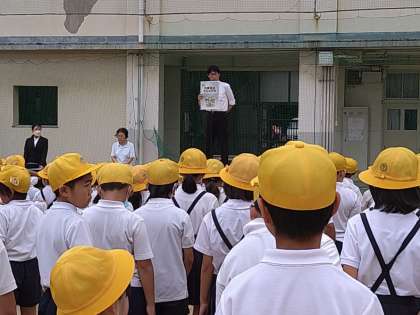 全校朝会のようす 教育実習生の紹介と防災の日についてのお話がありました。