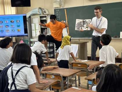 水野先生、ヨハン先生に来ていただき、歌を歌ったり、絵本を読んでいただいたりしました。