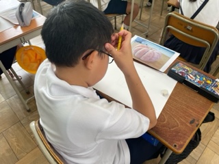 1学期から育てていた勝間南京の絵を描いています。細部までよく見て取り組んでいます。
