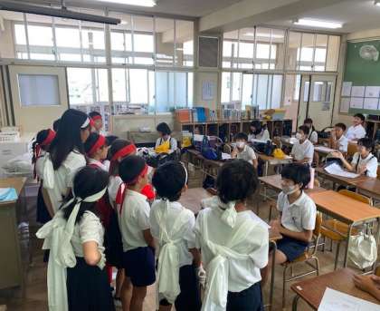 朝の会の時間に応援団の人たちと応援合戦の練習をしました。 大きな声で応援ができるようにがんばりましょう!
