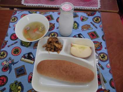 本日の給食の献立をご紹介します。本日の献立は、ライ麦パン、なすのミートグラタン、鶏肉と野菜のスープ、りんご、牛乳でした。