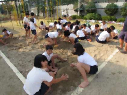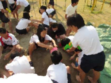 6年生が、学級活動の時間を利用して、「みんな遊び」をしています。今日は、砂場で遊んでいます。砂山を作ったり、水鉄砲で遊んだり、楽しく遊ぶ6年生の子どもたちの表情は、低学年のころに戻ったかのようでした。