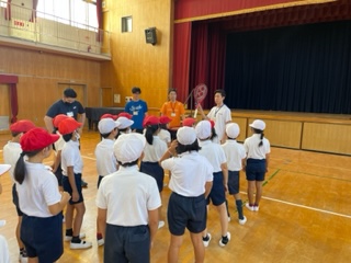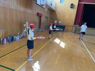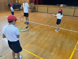 いよいよラケットを使います。ボールを乗せて落とさないように動かしています。