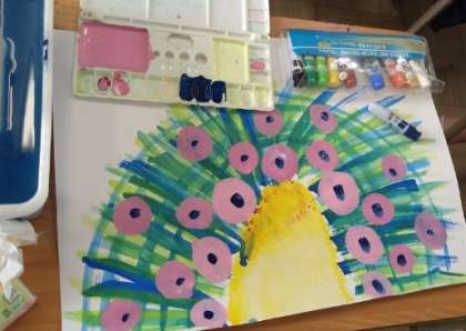 クジャクの羽に絵の具で模様を描きました。