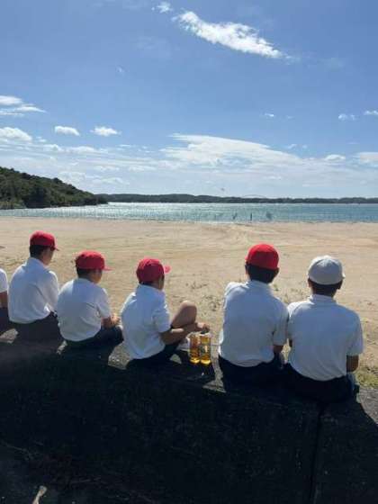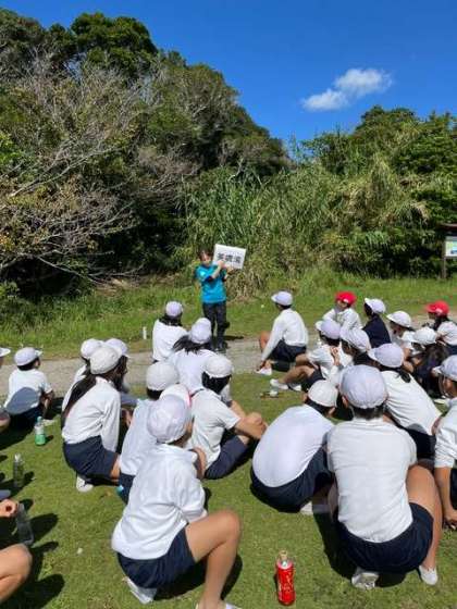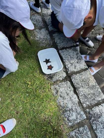 風が強いため、シーカヤックは中止となりました。グループに分かれて、クラフト体験と磯観察に取り組んでいます。