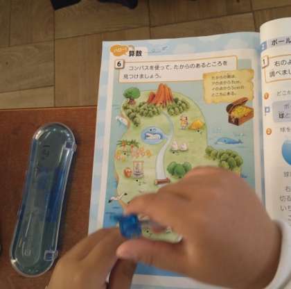 コンパスを使って、たからのあるところをさがす問題に挑戦しました。