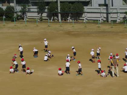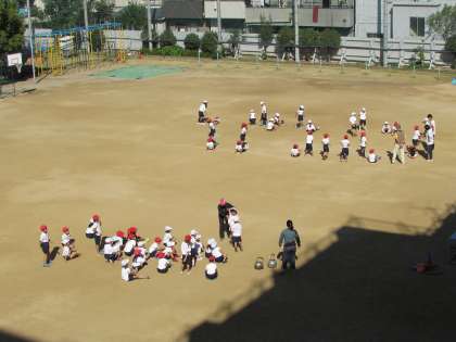 1年生が、運動場で体育をしています。2人で組んで、ぴょんぴょん跳ぶ体操をしています。
