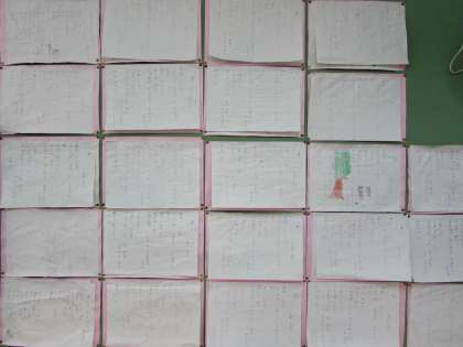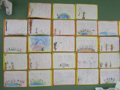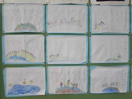 1年生の国語の作品です。「木」「あるけあるけ」という詩を、ていねいに視写しました。