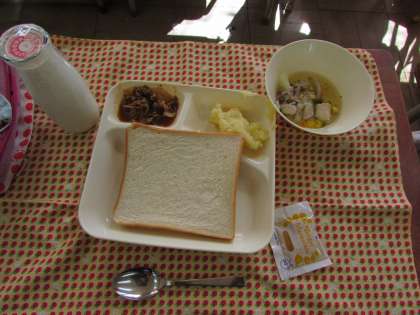 本日の給食の献立をご紹介します。本日の献立は、食パン、マーマレード、牛肉と野菜のケチャップソテー、スープ、スイートポテト、牛乳でした。
