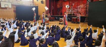 2時間目に芸術鑑賞会として、世界を旅する和太鼓集団「倭 YAMATO」が千本小学校の講堂で、公演をしてくださいました。