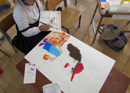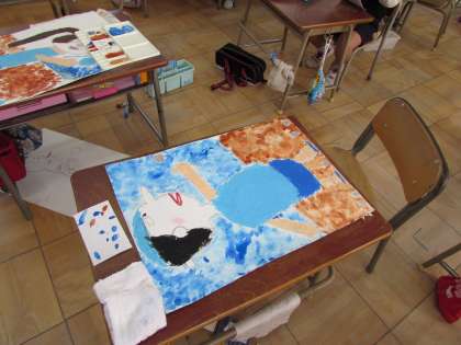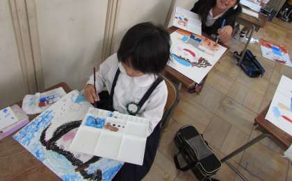 1年生の図画工作の学習の様子です。絵の具を使って、運動会の絵に色を付けていっています。大きな絵に、しっかりと色塗りをしています。