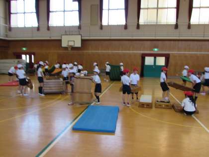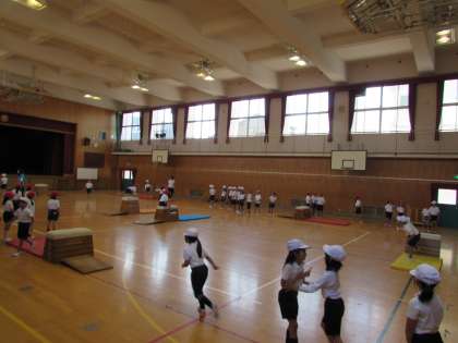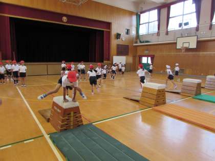 2年生の体育の学習の様子です。跳び箱を縦にしたり、横にしたりして、跳んでいます。授業の後半には、跳び箱を並び替えて、カタカナの「ロ」の形に置き、跳んでいっています。