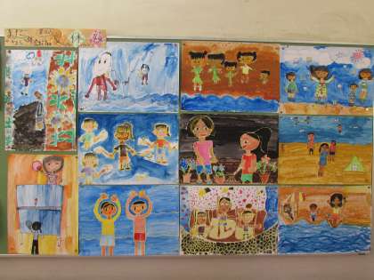 10月19日(月) 3年生の作品が、階段の踊り場に掲示されています。夏休みの思い出を、表現しました。