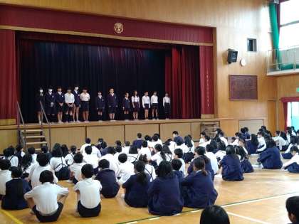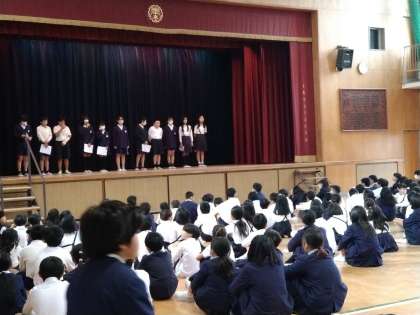 今日の集会は、図書委員会の発表と後期代表委員会の紹介でした。