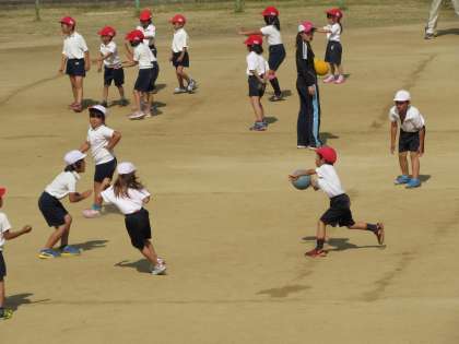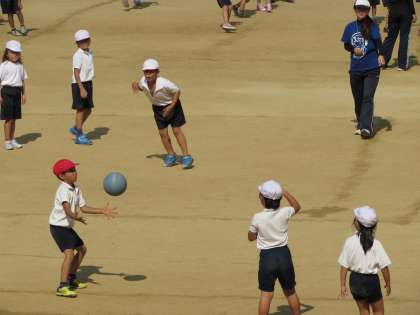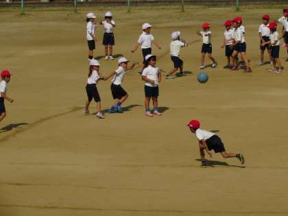 1年生の体育の学習です。1年生は、「てのひらドッジ」をしています。「てのひらドッジ」とは、てのひらに当たるのはOK、というルールで行うドッジボールです。1年生の子どもたちも、ボールを投げるのがずいぶん力強くなりました。