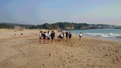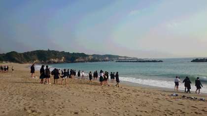 志摩スペイン村に行く前に、浜辺で少しの間、自由に過ごしています。