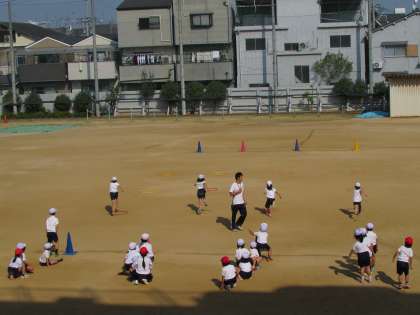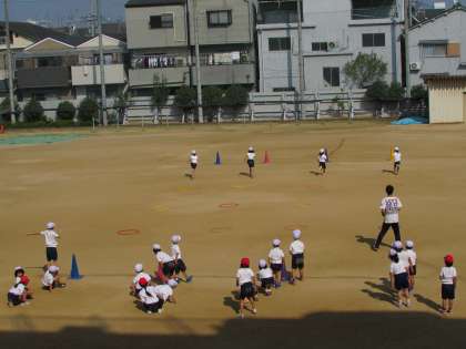 1年生の体育の学習をご紹介します。今日は、4つのグループに分かれて、リレーに取り組んでいます。コーンを回って、次の子にバトンを渡します。