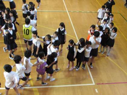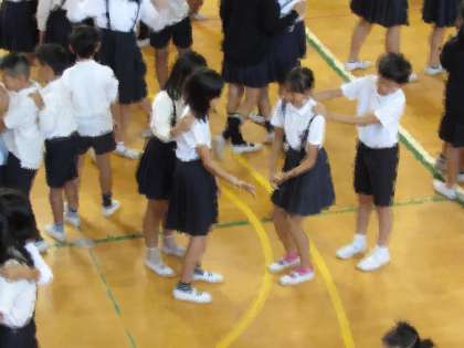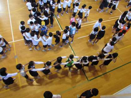 木曜日の朝、児童集会の様子をご紹介します。本日の集会は、「じゃんけん列車」です。じゃんけんを繰り返すうちに、長い長い列車ができました。