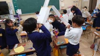 算数の「かたちあそび」では、箱を積み重ねたり、並べたりと、箱の特徴を生かしたあそびを考えて楽しみました。